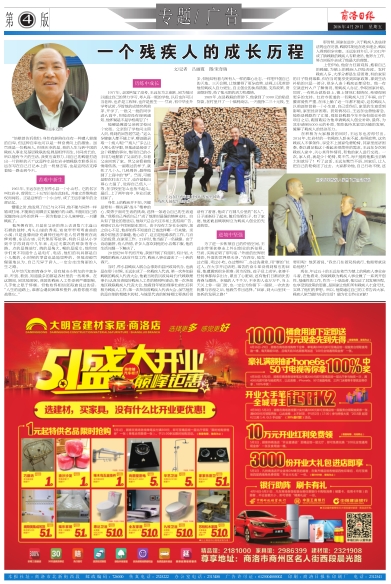 身体上的残疾并不怕,关键是要有一颗充满“战斗”精神的心,要勇于面对生活的挑战,选择一条适合自己的生活道路。“我要自己养活自己!”成了他那时最强的精神支柱。自从有了创业的想法后,他每天总会关注市场上的招商广告,希望可以从中找到创业项目。由于没有太多社会阅历,加之信心不足,他却始终不知道自己该选择哪一行来做。亲戚介绍他去学裁缝,他心动了,这正是他渴求的工作,几百元的投资,在家里工作。21岁时,他当起了一名裁缝。由于肯动脑筋,待人热情,许多人喜欢到他的小店做衣服,他的生活问题一下解决了。