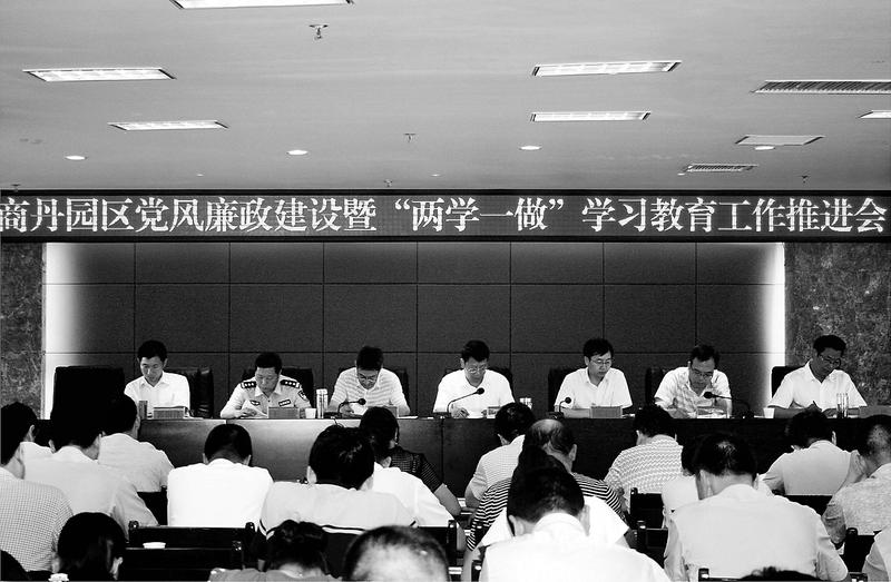 近日,商丹园区召开党风廉政建设暨“两学一做”学习教育推进会,专题部署2016年下半年商丹园区党风廉政建设工作任务和“两学一做”学习教育工作任务。会上,商丹园区党工委书记、管委会主任周和斌与各部门、各单位主要负责人签订了2016年度党风廉政建设和反腐败工作目标责任书。 (杨 涛 摄)