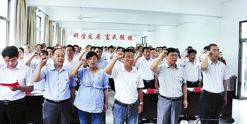 6月26日,镇安县米粮镇隆重庆祝中国共产党成立95周年,116名党员代表重温入党誓词,表彰、奖励了树坪等6个先进基层党支部,李荣金等6名优秀党支部书记,张润宏等6名优秀党支部第一书记,张博等32名优秀共产党员。(陈绍有 摄)