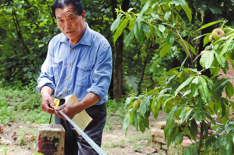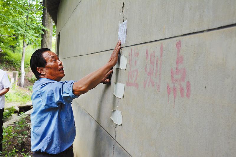 6月23日下午4点多,因轻度脑梗在城里住院的邵汉民挂完吊瓶,喊来护士拔掉针,就急匆匆骑着摩托车往家里赶。从22日晚上开始,阵雨时断时续,到现在空中仍飘散着雨点,回到家时邵汉民的衣服已经半湿,他换上雨鞋,拿上尺子、记录本,撑开雨伞,来到村民王立志家门口的记录点,测量了水泥监测桩之间的距离,“5.955米,两天走了5毫米!”他叹息一声,做好记录。在村民王小志门前,他查看墙壁上的裂缝,又到几处监测点及危房户家里,测量、记录,再三叮嘱群众:“这两天有雷阵雨,夜里都警醒点,要是雨大的话听我指挥,按原定线路撤离,千万不敢耽搁!”巡逻了一大圈后,时近晚上7点,邵汉民回到家里吃了碗面,打开喇叭将雨情向群众作了通知,又拿起手电筒奔向11组的李胜家。李胜是个盲人,他家又是重要监测点,这样的雨夜他不放心……