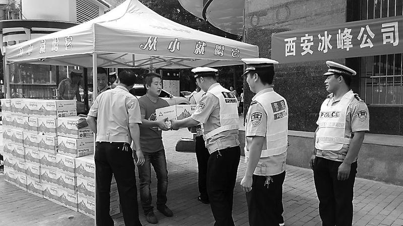 8月10日,西安市糖酒集团有限公司冰峰食品饮料分公司深入洛南县,为一线执勤交警送去144箱饮用纯净水,总价值6000元。