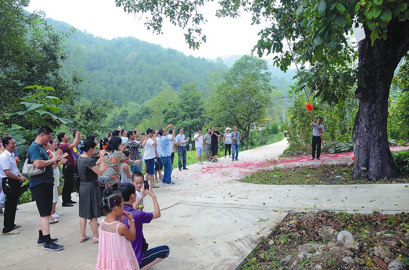 8月20日,商州区江山村270多年的老核桃树开杆收果。这是商洛市电子商务协会为了扩大对商洛优质老树核桃的宣传,今年特别举办的“商洛市首届老树核桃开杆节”,邀请社会各界代表相聚商州区江山村百年老核桃树下,共话商洛老核桃,促进产业发展与营销。(刘少鸿 摄)