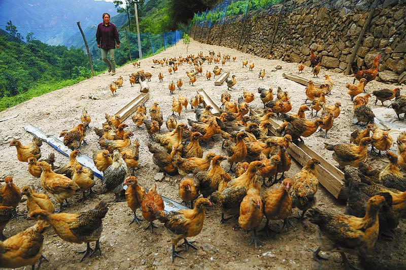 山阳县板岩镇宁家湾村宁江意散养柴鸡5000只,年收入10多万元,走上了致富路。(周丽莉 摄)