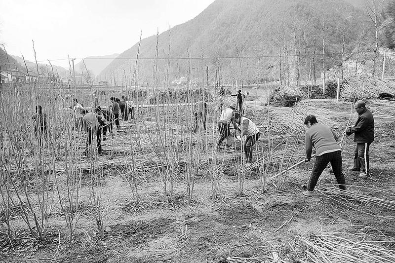 四月六日,在商州区杨斜镇秦华村的陕西普田源农业发展有限公司的基地里,百余名工人正在忙碌的栽种果桑树苗。据了解,这家公司已安置农民工就业一百余人,为群众带来收入累计一百三十余万元,帮助三十三户建卡立档的贫困户实现脱贫。(记者 王倩 摄)