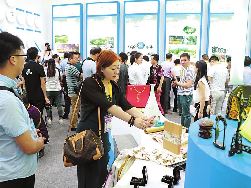 2017丝博会暨二十一届西洽会期间,商洛展馆的特色农产品吸引了与会代表纷纷拍照。(记者 李敏 柯岩 摄)