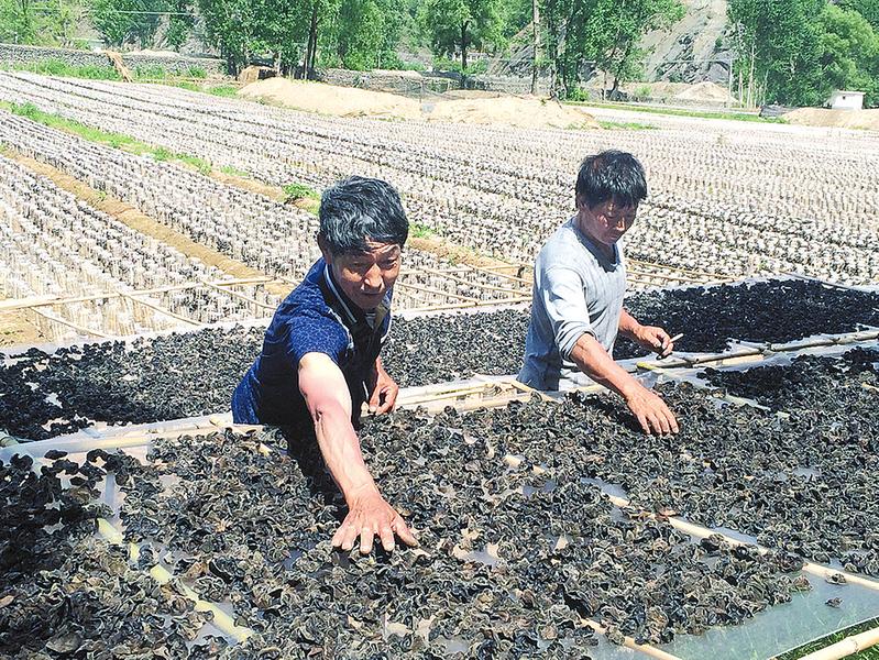 6月1日,柞水县杏坪镇肖台村村民正在晾晒黑木耳。市农业局联系陕西秦峰农业发展有限公司帮助肖台村13户贫困户发展地栽黑木耳20万袋,短短3个月时间实现产值70万元,纯利润达到20万元以上。(记者 刘婷 摄)