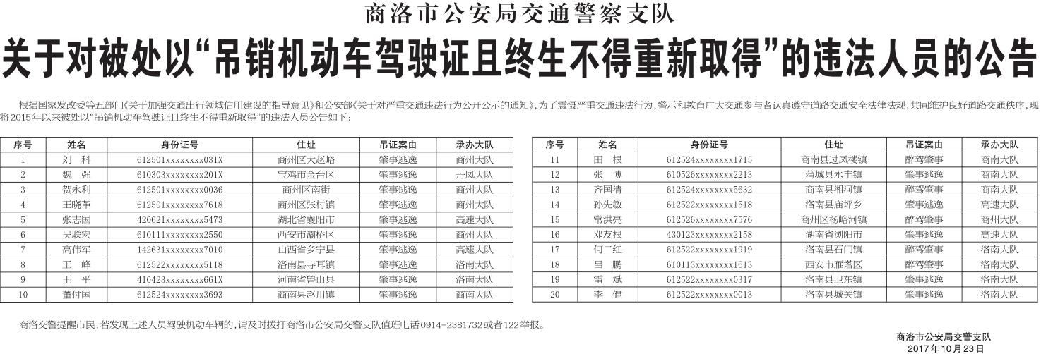 关于对被处以“吊销机动车驾驶证且终生不得重新取得”的违法人员的公告