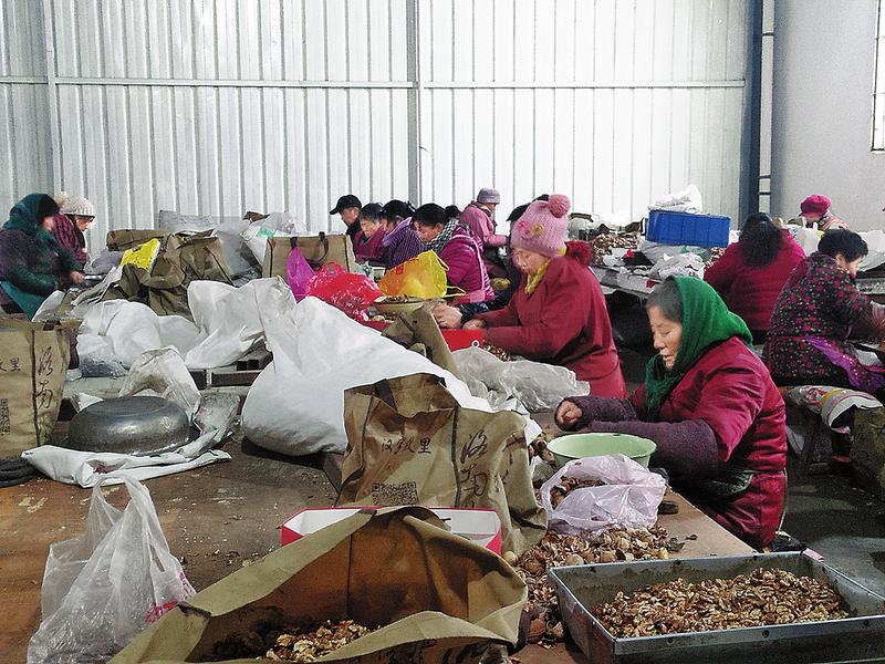 12月14日,洛南县永丰镇留守妇女和贫困劳动力在中良核桃专业合作社从事核桃仁加工。省级就业扶贫基地中良核桃合作社采取“合作社+贫困户”模式,吸纳贫困户入股发展核桃产业,为周边200多名群众提供就业岗位从事核桃加工,每人每天可增加收入40元。(刘卫锋 摄)