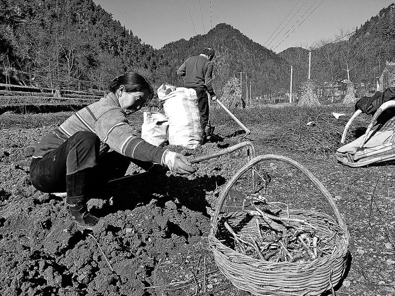 近日,商州区北宽坪镇广东坪村赖宏军夫妇正在挖桔梗。据了解,今年由于桔梗收购价下降,药农收入近乎减半。药农希望政府能够帮群众找销路,解决桔梗收购价低、销售难的问题。(记者 吕丽霞 摄)