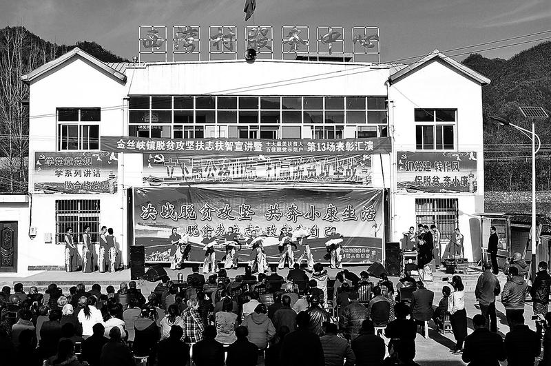 12月8日,商南县法院联合金丝峡镇党委、政府及县剧团,在西湾村开展以“扶志扶智宣讲暨十大最美扶贫人、百佳脱贫示范户表彰”为主题的文艺汇演活动,为当地群众送去了一场文化盛宴,坚定群众脱贫致富的决心和信心。(薛源 何春红 摄)