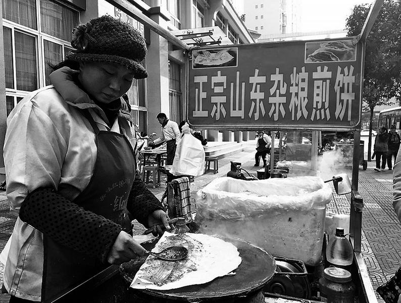 38岁的王会萍从大荆镇来到城里卖煎饼果子已经是第三个年头。简陋的设备,不大的摊点,却撑起了王会萍夫妻俩的全部生活和希望。