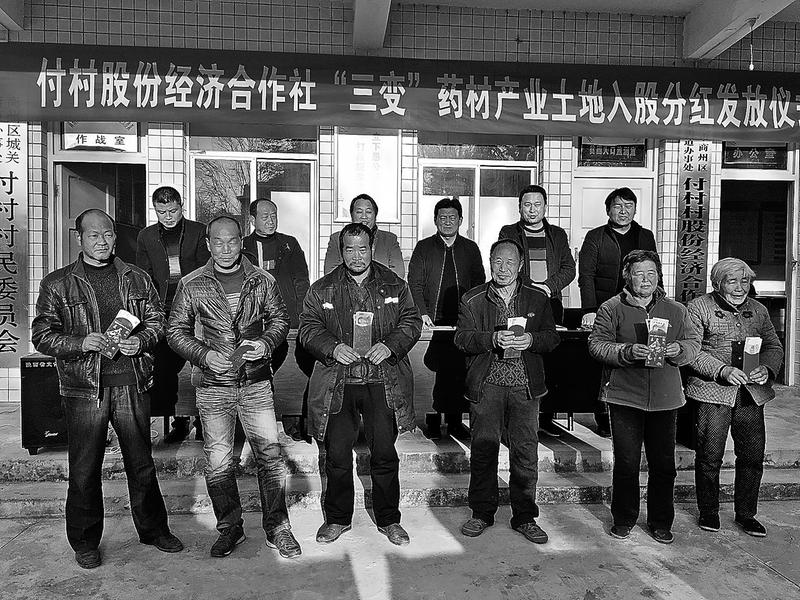 12月26日,商州区城关街道办事处付村61户群众首次从付村股份经济合作社领到土地入股分红,尝到了“三变”改革带来的甜头。据了解,付村今年流转土地50亩发展中药材种植产业,农民以土地作价入股分红,加快了精准脱贫步伐,促进农民增收,助推贫困户脱贫。(记者吉文艳摄)