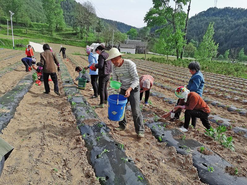 五月九日,洛南县寺耳镇伍仙村贫困户正在栽种辣椒苗。近年来,寺耳镇鼓励发动贫困户发展线辣椒订单种植一千三百亩,贫困户户均一亩,辣椒收获后由企业统一收购,亩产值可达四千元左右。(记者 吉文艳摄)