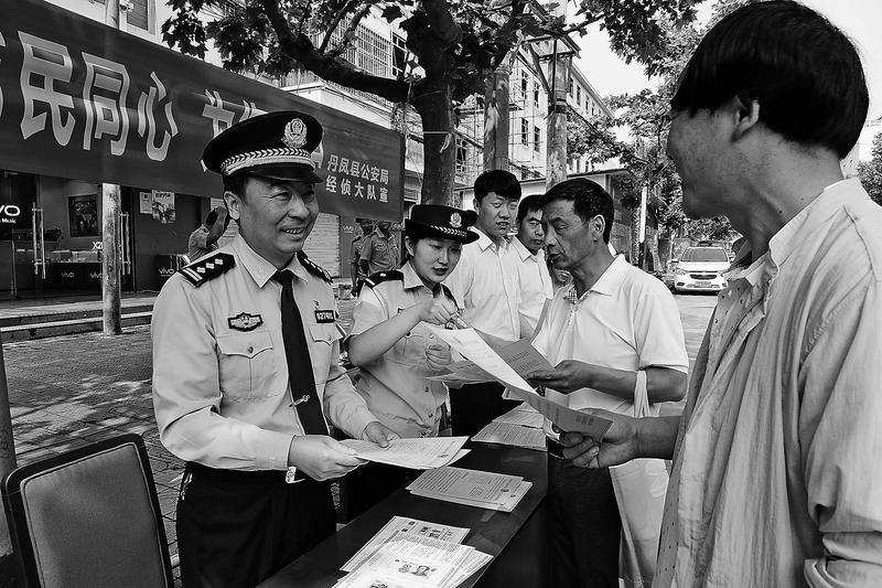 五月十五日是全国第九个﹃打击和防范经济犯罪宣传日﹄。丹凤县公安局联合县烟草公司在街头开展﹃与民同心为您守护﹄为主题的宣传活动。通过展板展示、案例讲解,使群众了解近年来多发经济犯罪的新型犯罪手法,做到提早防范,并公布举报电话,让群众积极参与打击经济犯罪活动。(记者 谢非 通讯员 周修聪 摄)