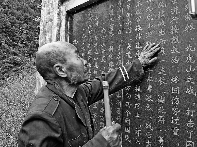 村民赵举水抚摸着纪念碑上烈士西海的名字