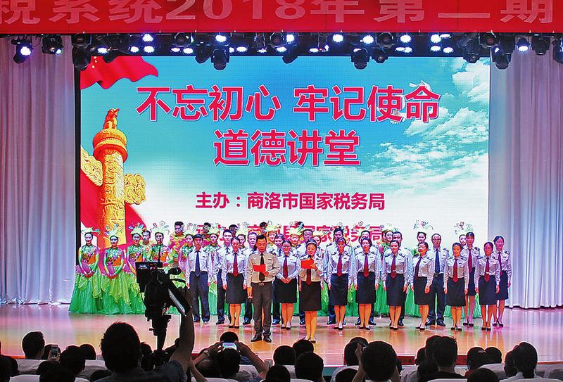 6月26日,由市国税局主办的2018年第二期道德讲堂在商南县举行。道德讲堂以“不忘初心、牢记使命”为主题,采用事迹宣讲和文艺演出相融合的方式,将身边爱岗敬业、孝老爱亲等看得见的“平民英雄”和“凡人善举”分享出来,传播正能量,树立新风尚。(刘小翠 何春红 摄)