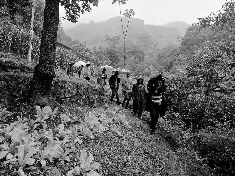 此刻雨越下越大,每一滴都重重地砸在李毅的心上。老天爷好像在考验着他们这些扶贫干部的诚心与决心。由于体力有限,大家轮流抬着担架,互相搀扶着一步一步地往山下走,闻讯赶来的乡亲也纷纷参与其中。山路上的杂草已经没过了大家的膝盖,脚下的黄泥和着雨水将随行的队员滑倒了好几次,抬着担架的队员们硬是咬紧牙关,双手紧握,一步一个脚印将老人高高地稳稳地举起。然而由于道路泥泞不堪,走到半山腰时,山间小路已经十分湿滑,队员们的每一脚都走的小心翼翼,为了安全起见,大家决定轮流背着老人下山。