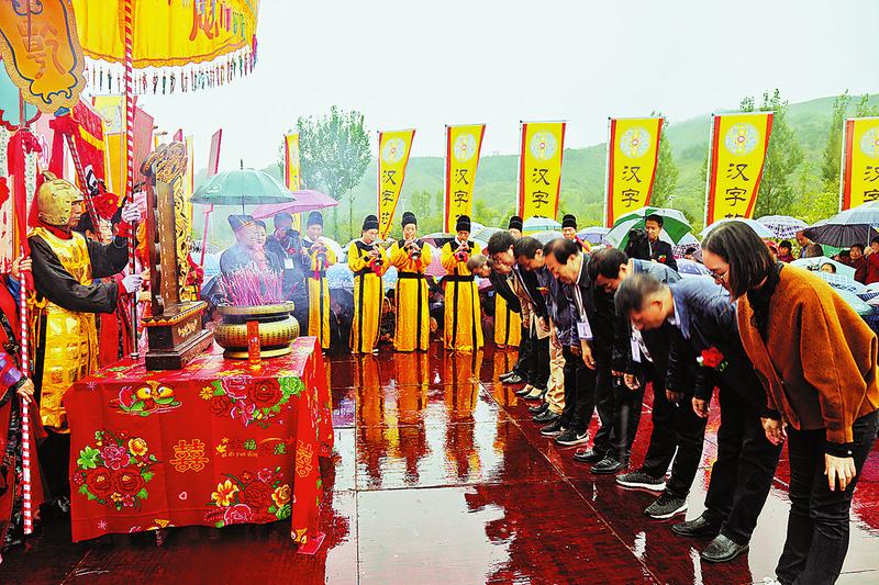 本报讯(记者 赵有良)9月16日,“弘扬仓颉文化助力脱贫攻坚”国家级非遗项目“仓颉传说黑潭遗址”授牌仪式暨非遗节目展演活动在洛南县保安镇黑潭村举行,省、市、县有关领导、嘉宾、文化学者、书画名家以及该县文广局、文化馆和保安镇的干部职工、黑潭村群众、新闻媒体、企业界朋友数百人冒雨参加了活动。