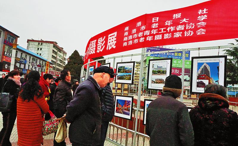 十二月二十六日,由商洛日报社、市老年大学、市老青协、市老摄协联合举办的《庆祝改革开放四十周年﹃金年华﹄艺术摄影展》在市中心广场隆重开展,共展出协会会员和记者摄影作品一百三十多组幅,同时还展出本报主办的﹃图说四十年﹄视觉专刊十期,展出作品从老百姓衣、食、住、行等方面发生的巨大变化,展现了改革开放四十年来我市取得的辉煌成就和发展变化。展出为期三天。(记者 王倩 摄)