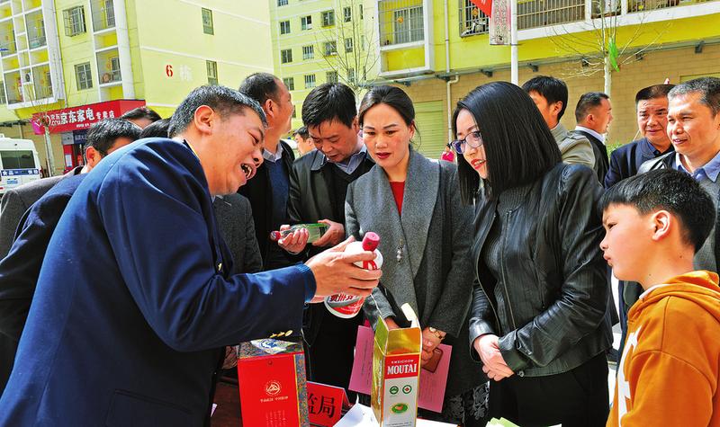 3月23日,山阳县举行2019年文化科技卫生“三下乡”暨第二十七届“科技之春”宣传月集中示范活动。200多名干部和科技人员通过设立服务咨询点、发放资料、展示展板挂图等多种形式,向群众宣传农业技术、生态保护、卫生健康、科技创新等方面知识。图为山阳县市场监督管理局工作人员介绍假酒的识别。
