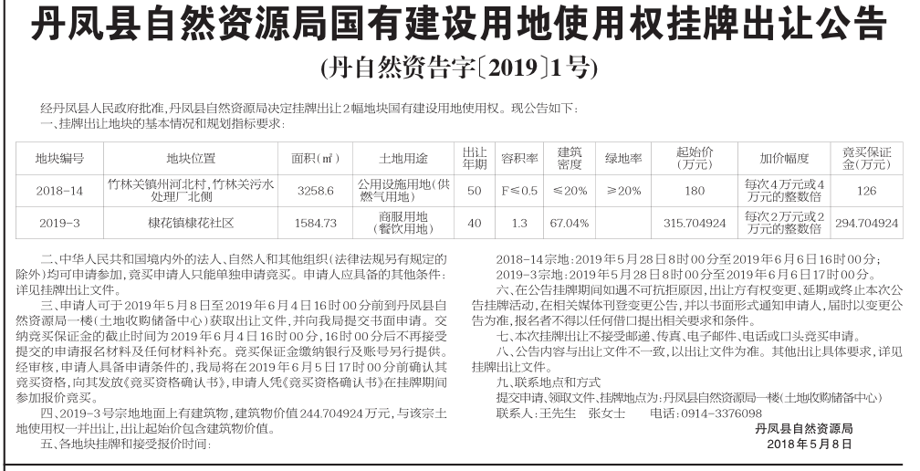 丹凤县自然资源局国有建设用地使用权挂牌出让公告