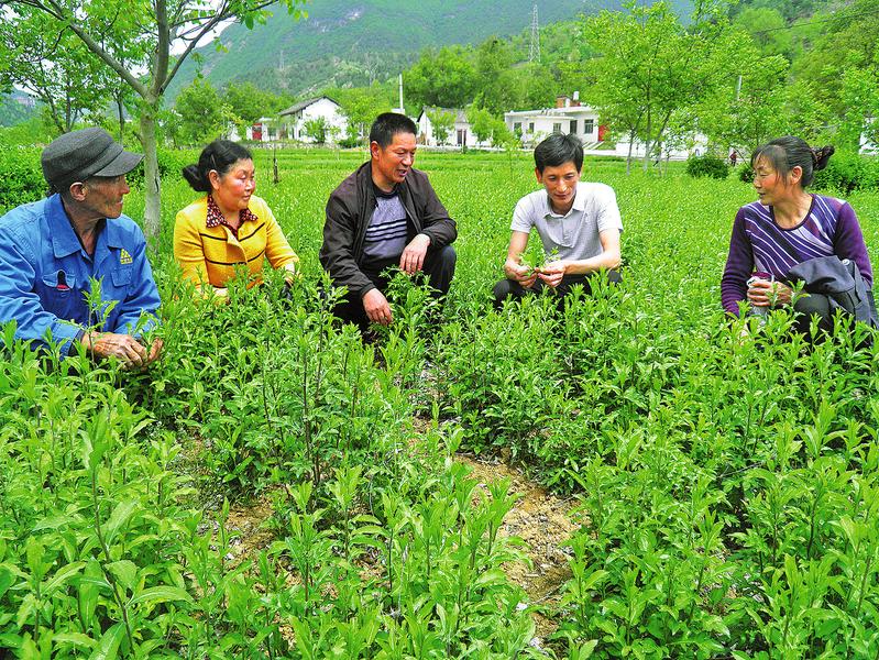 业基地、示范园,指导药农做好春夏之交药田科学管理。图为技术人员与药农们探讨药田病虫害防治。(刘春荣 摄)