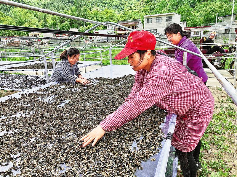 近日,在商州区麻街镇食用菌产业扶贫种植基地,工作人员正在晾晒木耳。该基地年生产食用菌500万袋,通过“公司+基地+合作社+贫困户”模式,带动全镇440户贫困群众发展食用菌,实现稳定增收。(记者方方摄)