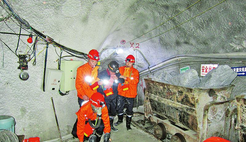 5月12日,镇安县应急管理局联合镇安县月西矿业有限责任公司开展安全事故应急救援演练,强化员工安全意识,提高矿山发生安全事故时,全员的组织、指挥、应急处置和协作配合能力。图为应急救援人员演练井下废气中毒事故发生后的救援工作。(齐荣强 摄)