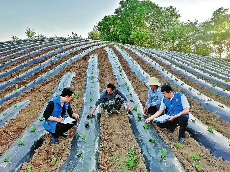 近日,镇安县气象局技术人员到青铜关镇烤烟基地进行烤烟生长调查,了解气象服务需求,为产业增收保驾护航。 (程卫红 摄)