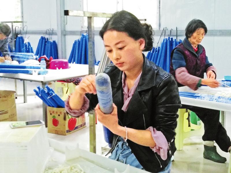 近日,山阳县高坝店镇黄土凸村贫困户妇女在社区工厂加工肠衣。该村引进陕西亨恒肠衣加工股份有限公司来村里建厂,安置30名贫困户妇女在家门口就业,每人月收入1100多元。(记者 贾书章 摄)