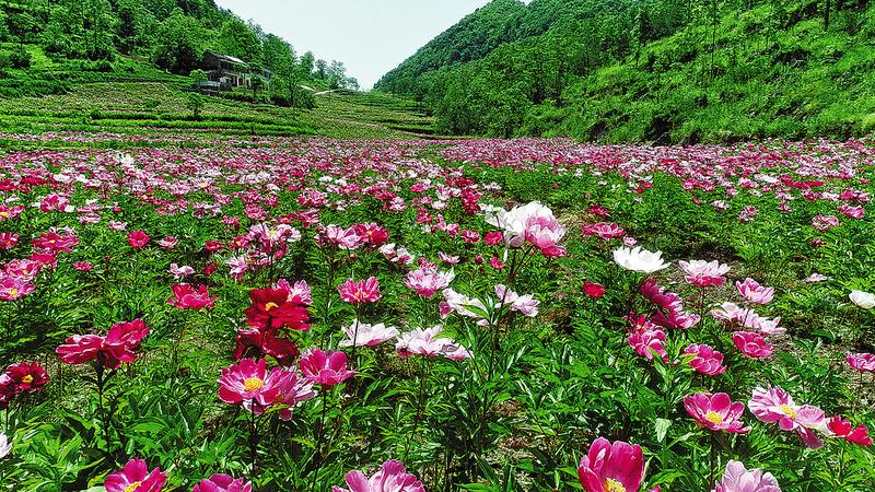 仲夏时节,走进镇安县西口回族镇石景村的田间地头,只见满山遍野姹紫嫣红的芍药花正在竞相开放,三五成群的工人穿梭在花丛当中,有说有笑地采摘花朵,为寂静的北阳山增添了一道亮丽的风景线。