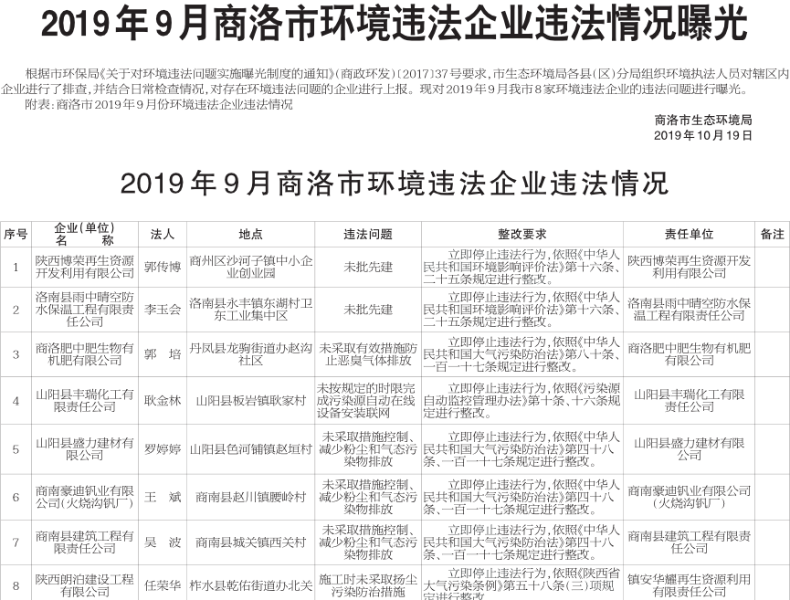 2019年9月商洛市环境违法企业违法情况曝光