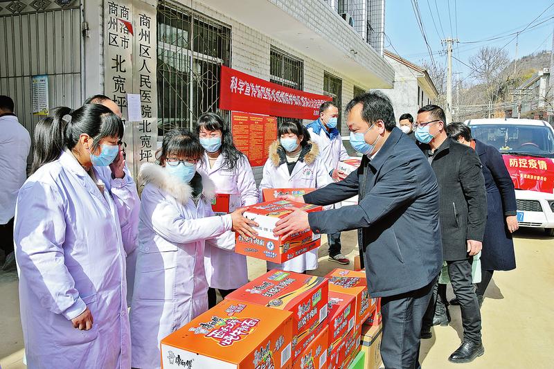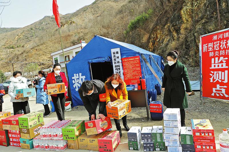 2月21日,市妇联携手市女企业家协会到商南县湘河镇三省交界防疫卡点开展捐赠慰问活动,为卡点送去了价值37560元的防疫物资及生活用品,解决了一线物资短缺的燃眉之急,为执勤人员筑起了一道安全防线。(记者 李亮 摄)