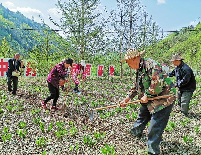 近日,镇安县云盖寺镇黑窑沟村村民在金凤凰公司中药材示范基地播种施肥。该基地共30亩,以种植白及为主,同时套种油葵,带动周边20多户农户务工增收。(记者 柯岩摄)