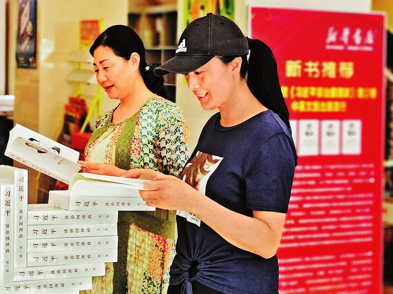 七月七日,在市新华书店,市民正在学习《习近平谈治国理政》第三卷。连日来,市新华书店结合﹃党建系列图书主题展﹄开展全方位宣传征订工作,推动广大党员干部群众学习贯彻习近平新时代中国特色社会主义思想走深走实。(党率航摄)