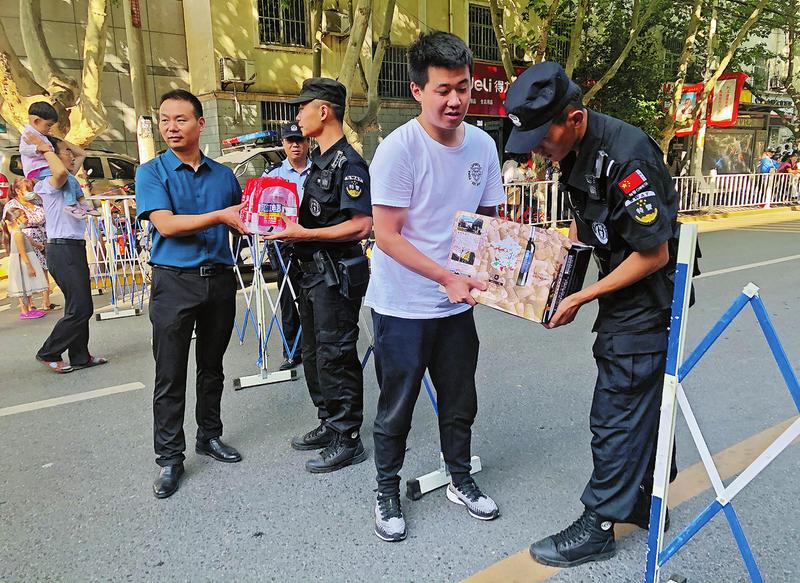 △7月7日,许多爱心商家集中开展“助力高考、爱心送水”志愿服务活动,给考生及其家长、民警等免费提供矿泉水、饮料。(方方摄)