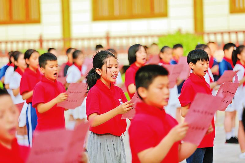 徜徉国学天地,争当书香少年。7月8日,镇安慧源学校少先队大队部百人经典诵读活动在镇安县金台山开展,旨在通过经典诵读,激发学生学习祖国优秀文化的兴趣,从而形成浓厚的校园文化底蕴。(晓阳 摄)