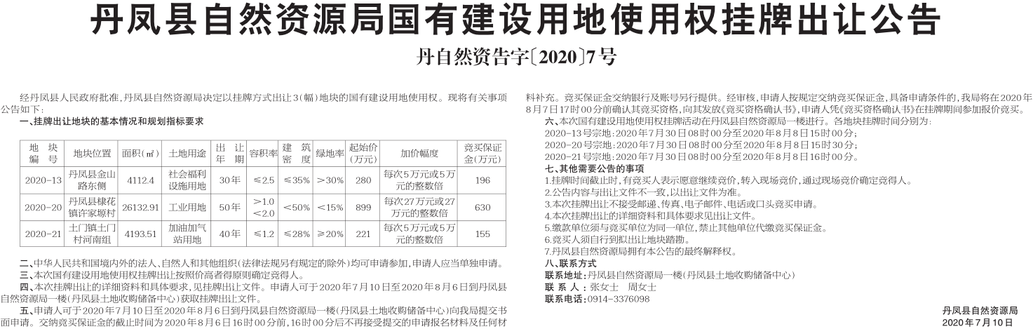 丹凤县自然资源局国有建设用地使用权挂牌出让公告