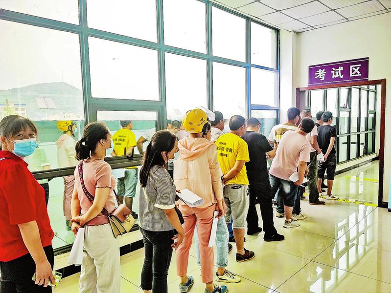 7月10日,市民在排队等候摩托车科目一考试。据了解,摩托车驾照分为两轮E照、F照和三轮D照三种类型。(杨鑫 摄)