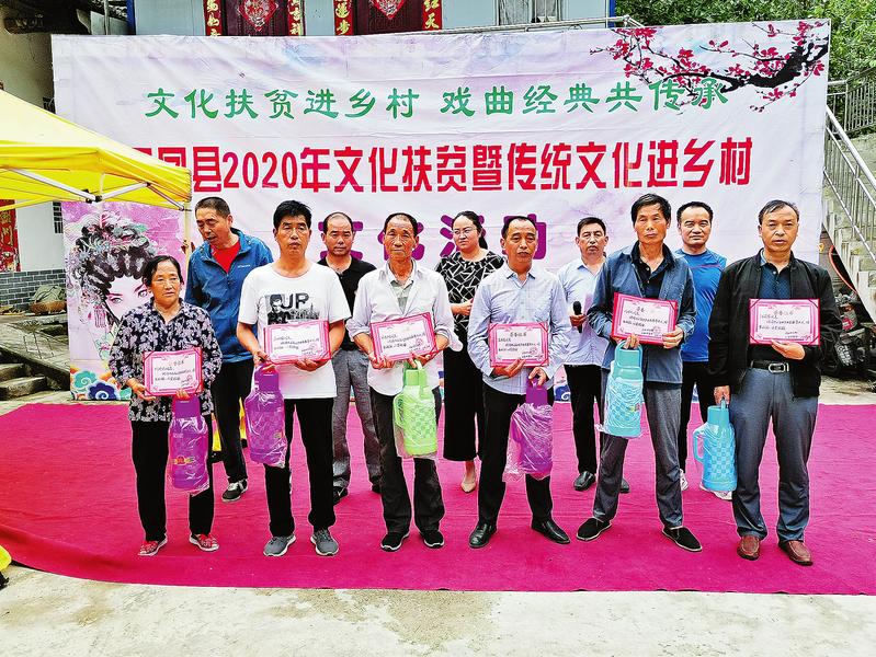 近日,丹凤县寺坪镇石庙村两委会邀请县剧团到村进行文艺演出,以“文化扶贫进乡村打赢打好脱贫攻坚战”为主题扶志扶智,并对10名脱贫示范户、产业发展带头人、孝老爱亲示范户进行表彰,激发贫困群众脱贫攻坚的内生动力。 (樊利仁 摄)