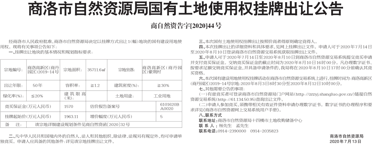 商洛市自然资源局国有土地使用权挂牌出让公告