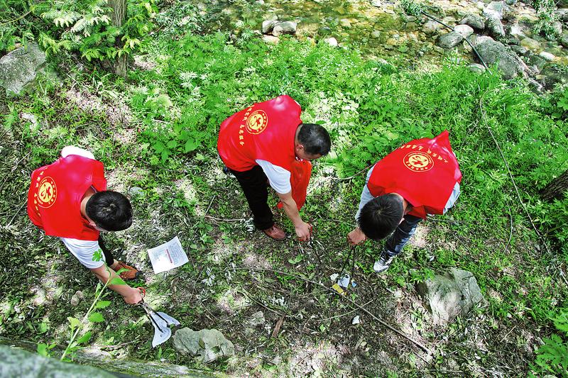 今年以来,柞水县把大力发展绿色环保经济与着眼大秦岭护绿文明行动有机结合起来,形成人人爱护环境的良好氛围。图为近日柞水县环保文明志愿者在秦岭羚牛谷捡白色垃圾的一幕。(吴履山摄)