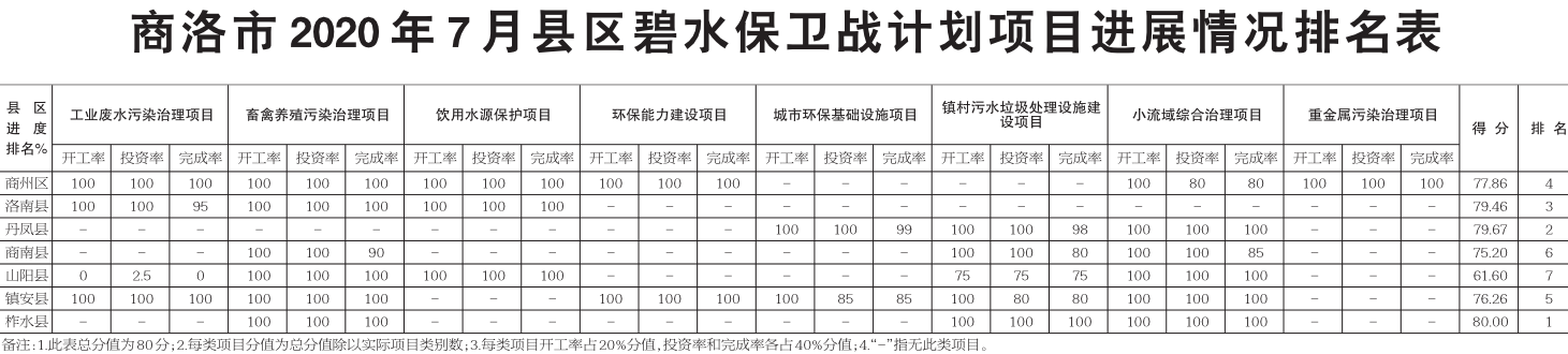 商洛市2020年7月县区碧水保卫战计划项目进展情况排名表