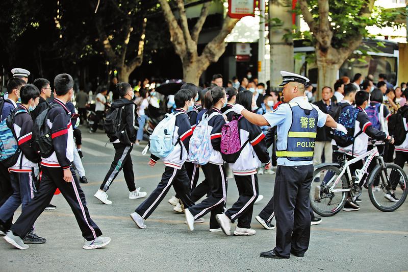 △9月1日,我市各学校开学。为保障广大师生出行安全,市公安局交警支队商州大队提前在市区设下12个护学岗,在上下学高峰时段,清理学校周边违停车辆,对各学校门口及周边路段过往车辆进行管控分流,指挥接送学生的车辆有序通行,护送学生安全过马路,全面维护辖区学校周边良好道路交通环境。(记者方方摄)