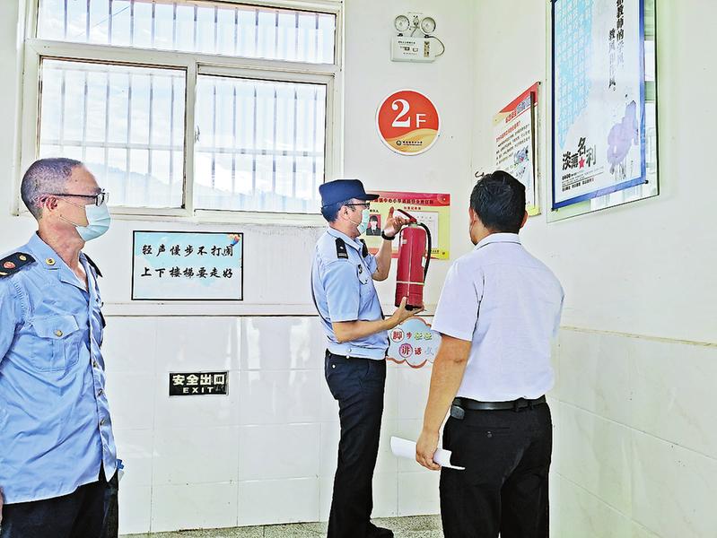 ▽为切实做好新学期开学首日护校工作,9月1日早7点多,柞水县公安局凤镇派出所组织民警深入辖区中小学,对校园内部的安防设施进行检查,全面消除各类安全隐患。(米昊摄)