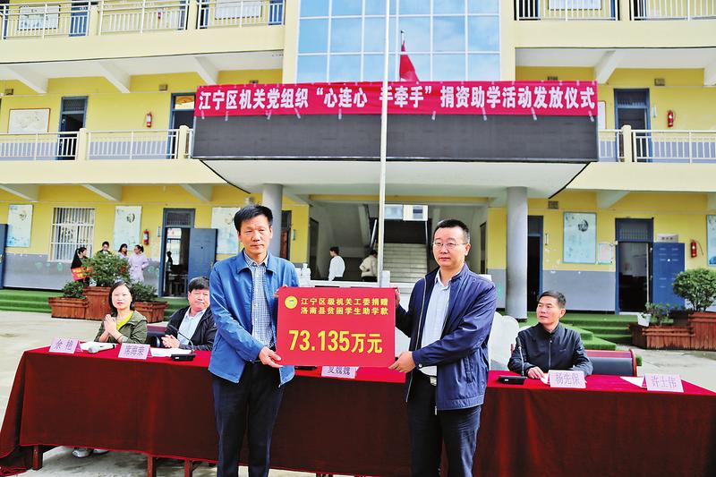 当天,南京市江宁区机关工委书记夏巍巍带领其他3名干部代表江宁区为洛南县捐赠助学金73.135万元,并现场为5名学生代表每人发放助学金1000元。据了解,在江宁区机关工委的支持与帮助下,2018年至今,江宁区已累计为洛南县投入捐资助学资金220.13万元,累计资助贫困家庭学生2504名,有效解决了全县贫困户子女“上学难”问题,为洛南县顺利打赢教育扶贫攻坚战奠定了坚实基础。