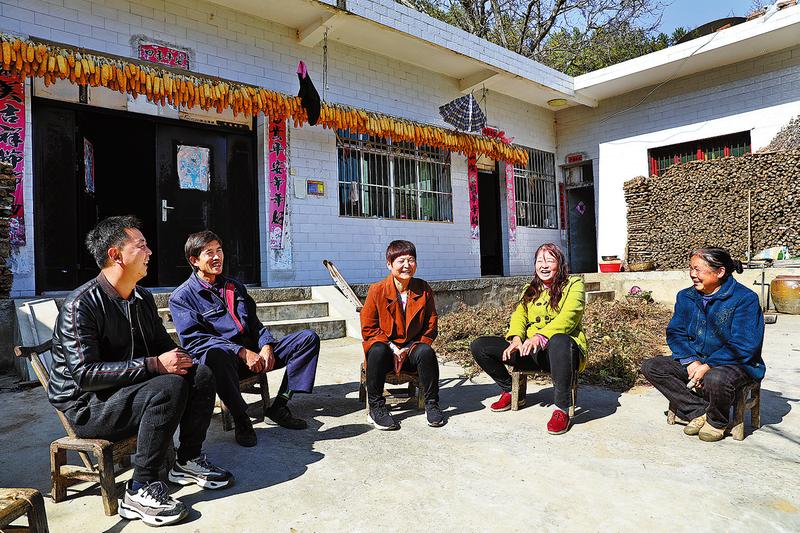 田金娥((左三)和包扶干部及乡亲们畅谈合作社发展事宜 她是一个普通的农家妇女,面对家庭困难,不等不靠,发愤图强。在包扶干部的支持关怀下,她带领贫困户妇女外出摘花椒、摘苹果、拾棉花,又在家乡发展天麻,她不但自己脱了贫,还成了当地有名望的致富带头人。她就是丹凤县峦庄镇汪家沟村的田金娥。