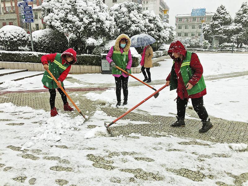 11月22日晚,一场大雪悄然降临,给广大市民出行造成了不便。为确保交通安全,11月23日一大早,商州区中心广场管理人员紧张有序地清扫广场积雪。(记者 王孝竹 摄)