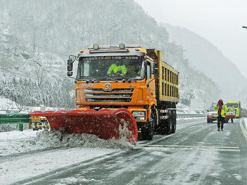 11月22日,商洛地区迎来今冬第一场强降雪,蓝商高速商州段秦岭隧道区域降雪超过10厘米。为保障人民群众安全顺利出行,蓝商分公司商州西管理所全员出击、昼夜奋战除雪保畅,保障了所辖道路的安全畅通。截至23日11时30分,共计出动人员80人、工具车4辆、5T自卸车3台、除雪车3辆、巡查车4辆,撒布融雪剂13吨。目前道路通行秩序良好。(郭淼 摄)