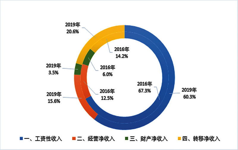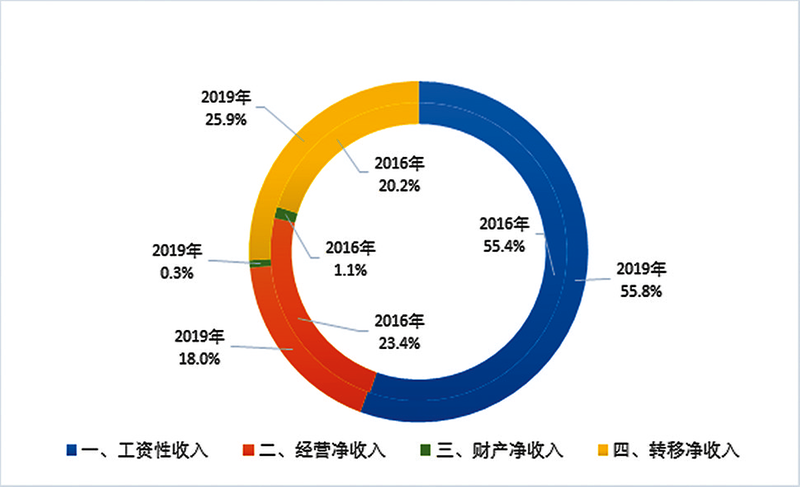 2019年,农村居民人均可支配收入10025元,其中四项收入比重为55.8:18.0:0.3:25.9,较2016年结构相比,呈现“二升二降”趋势,即工资性收入和转移性收入比重分别提高0.4和5.7个百分点,经营性和财产性收入比重下降5.4和0.8个百分点。